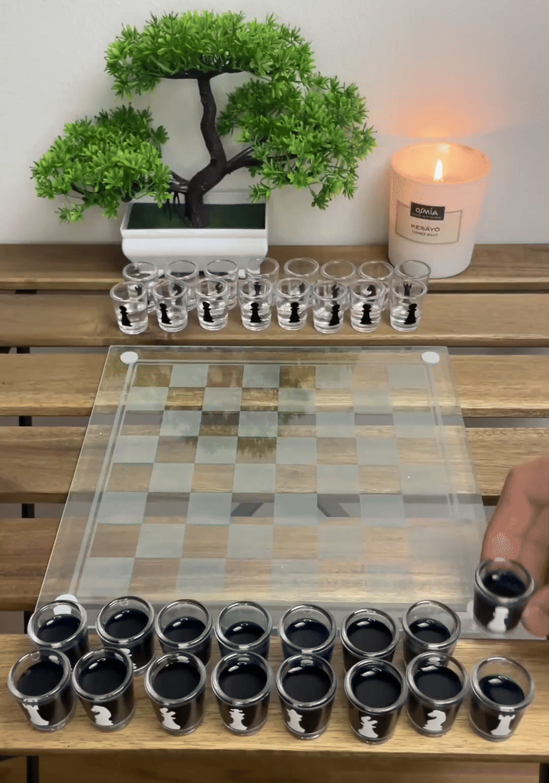 This sleek, all-glass chess board comes with 32 shot glasses as playing pieces. Every capture comes with a sip, turning classic gameplay into a battle of brains and booze. Perfect for parties, game nights, or a unique gift. Think you can outdrink and outthink your opponent?